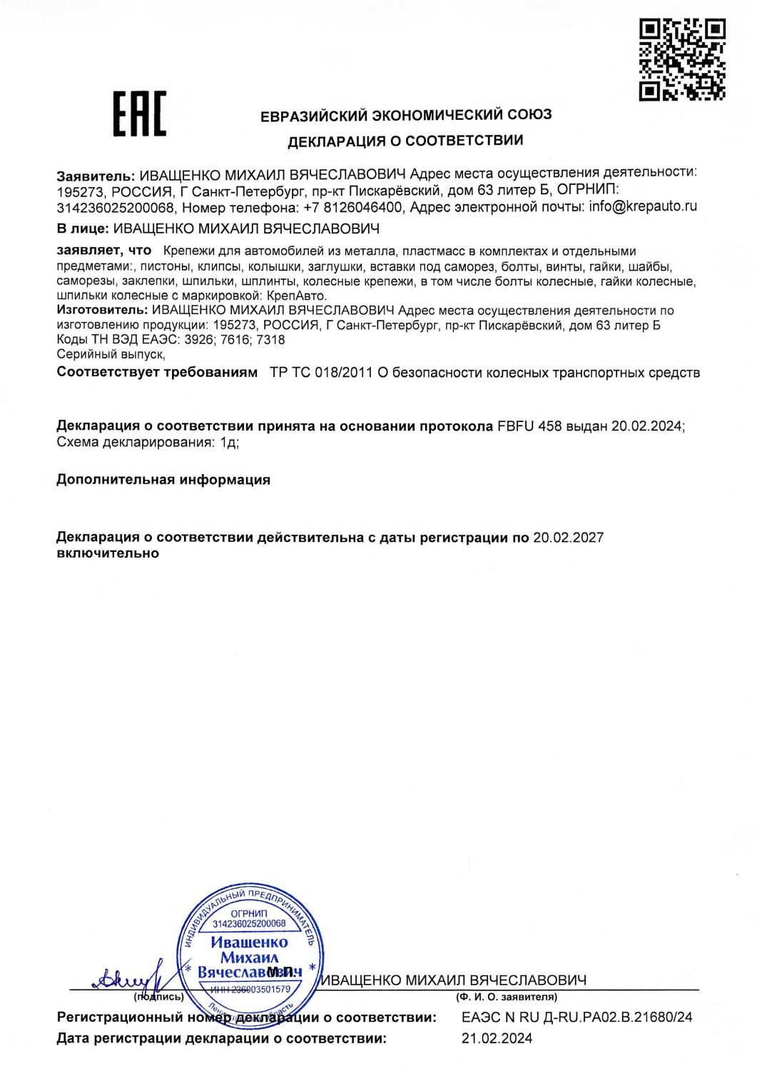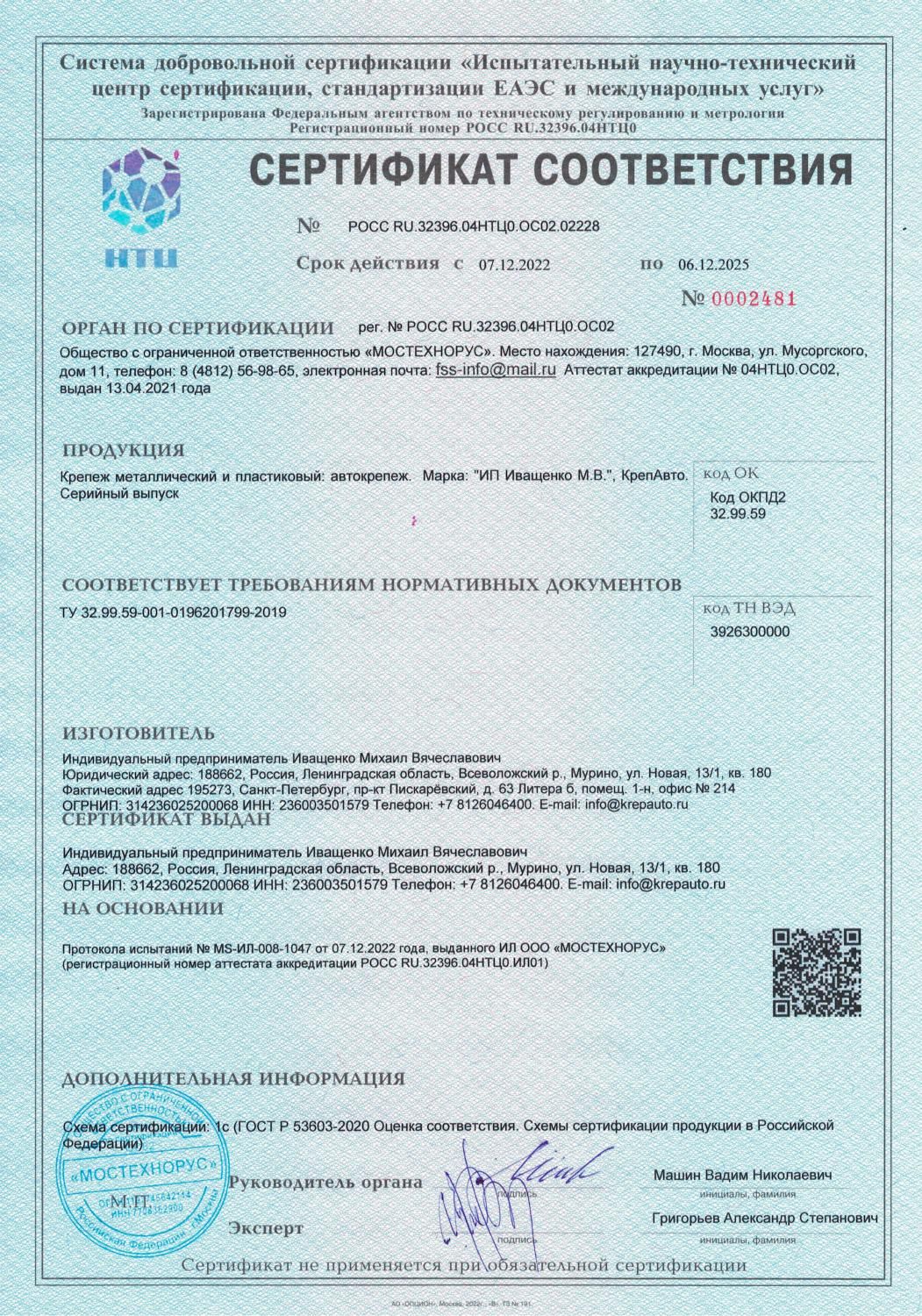 Продукция КрепАвто сертифицирована, соответствует Техническому регламенту Таможенного союза "О безопасности колесных транспортных средств". Товарный знак "КрепАвто" защищен правами интеллектуальной собственности.