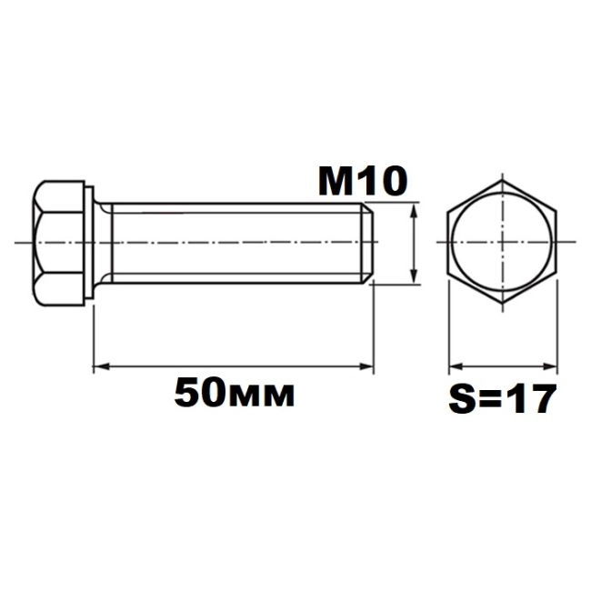 Болт М10х50 DIN933 кл.п. 10.9 оксидированный SW 17 с шестигранной головкой из нержавеющей стали применяется на промышленных производствах, в строительстве, ремонте грузового транспорта и сельхоз оборудования.