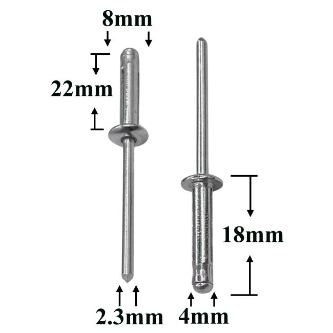 Заклепки 4×20 металлические — это универсальный вытяжной крепёж для неразъёмного соединения металлических и пластиковых деталей. Она применяется в кузовных и ремонтных работах, а также при сборке салонных элементов автомобиля.