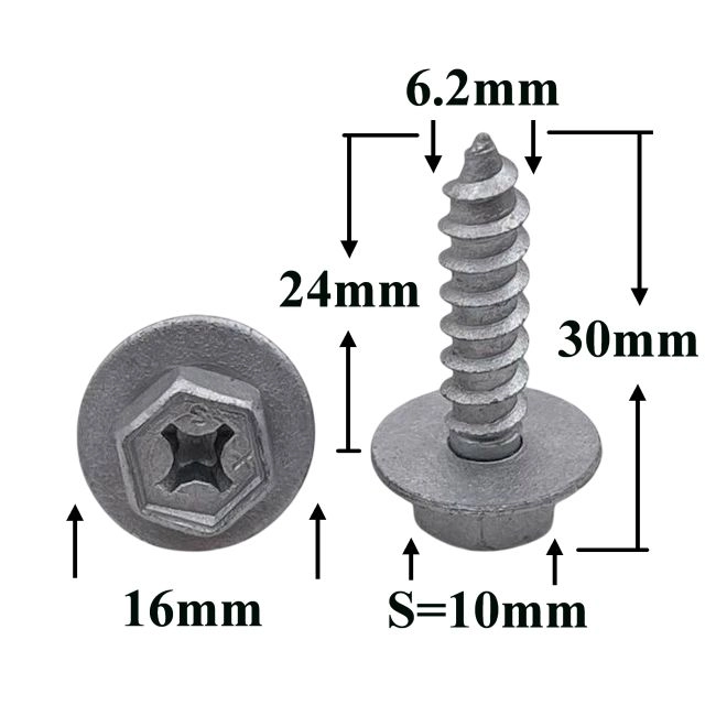 Саморез автомобильный 6.2x24 с шестигранной головкой и шайбой, серебристый S=10 — универсальный крепёж для кузовных элементов легковых авто. Изготовлен из высокопрочной углеродистой стали с антикоррозийным покрытием, он обеспечивает долговечность и надёжность, особенно в условиях российских дорог. Простота монтажа гарантирована — шлиц Phillips (PH).