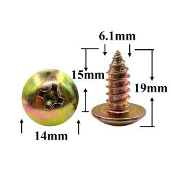 Саморез автомобильный 6.1x15 с полукруглой головкой, золотистый — универсальный крепёж для кузовных элементов легковых авто. Изготовлен из высокопрочной углеродистой стали с антикоррозийным покрытием, он обеспечивает долговечность и надёжность, особенно в условиях российских дорог. Простота монтажа гарантирована — шлиц Phillips (PH).