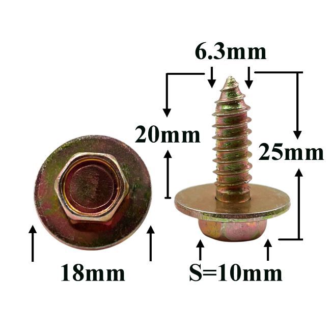 Саморез автомобильный 6.3x20 с шестигранной головкой и шайбой, золотистый S=10 — универсальный крепёж для кузовных элементов легковых авто. Изготовлен из высокопрочной углеродистой стали с антикоррозийным покрытием, он обеспечивает долговечность и надёжность, особенно в условиях российских дорог. Простота монтажа гарантирована — шлиц .