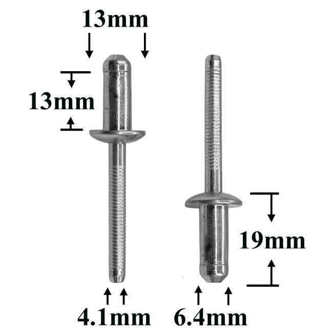 Заклепки 6,5×16,5 металлические — это универсальный вытяжной крепёж для неразъёмного соединения металлических и пластиковых деталей. Она применяется в кузовных и ремонтных работах, а также при сборке салонных элементов автомобиля.