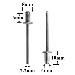 Заклепки ×8,6 металлические — это универсальный вытяжной крепёж для неразъёмного соединения металлических и пластиковых деталей. Она применяется в кузовных и ремонтных работах, а также при сборке салонных элементов автомобиля.