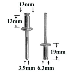 Заклепки 6,3×19 металлические — это универсальный вытяжной крепёж для неразъёмного соединения металлических и пластиковых деталей. Она применяется в кузовных и ремонтных работах, а также при сборке салонных элементов автомобиля.