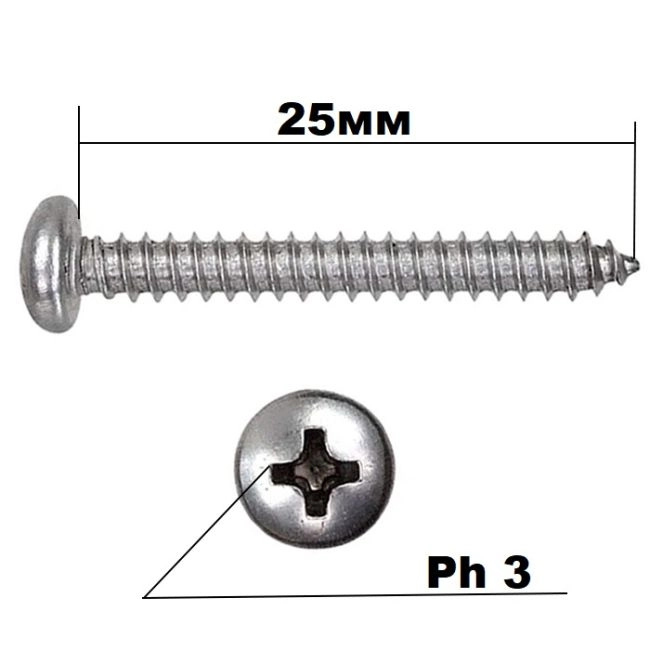 Саморез 5.5х25 DIN7981 остроконечный (оцинкованный) Ph 3 с полукруглой головкой из нержавеющей стали применяется на промышленных производствах, в строительстве, ремонте грузового транспорта и сельхоз оборудования.