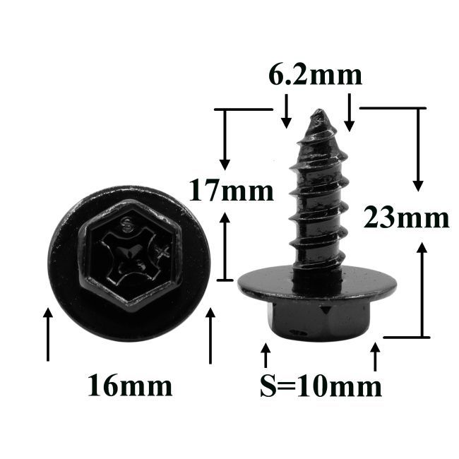 Саморез автомобильный 6.2x17 мм с шестигранной головкой и шайбой, черный S=10 — универсальный крепёж для кузовных элементов легковых авто. Изготовлен из высокопрочной углеродистой стали с антикоррозийным покрытием, он обеспечивает долговечность и надёжность, особенно в условиях российских дорог. Простота монтажа гарантирована — шлиц Phillips (PH).